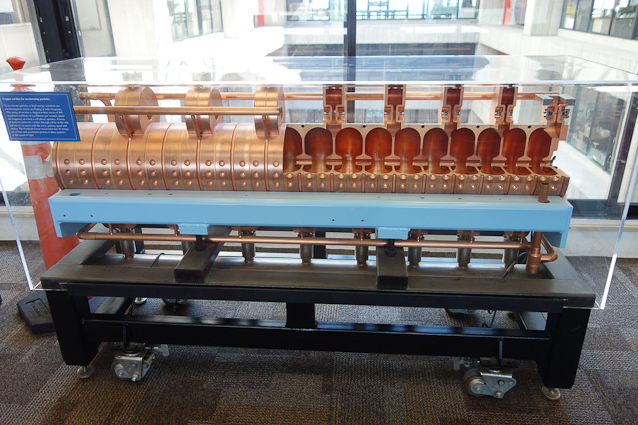 Fermilab's specialty is intense high energy proton beams. A section of accelerator was cut open to show the interior.