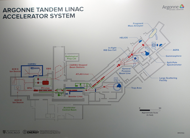 Our second stop at Argonne was ATLAS, which creates beams of heavy ions. Ions are created at the left and accelerated by a series of three linear accelerators. Collisions are detected in the upper right areas.
