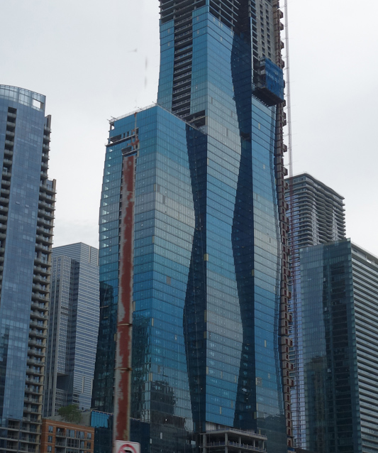 Note how the walls of the three parts of the building are not flat, but undulate.