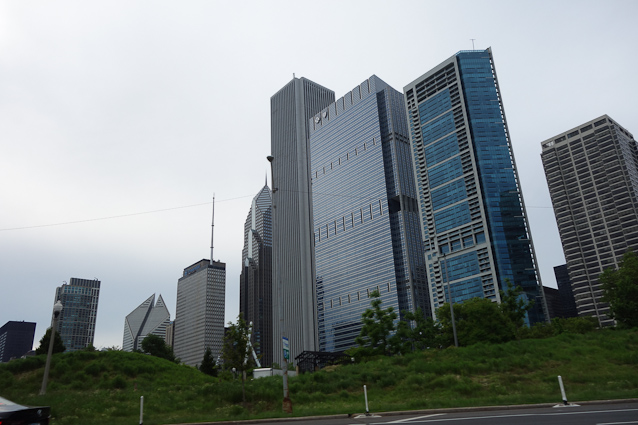 We were traveling south on Lake Shore Drive, passing Millenium Park. The Standard Oil building is the tallest one in the middle.