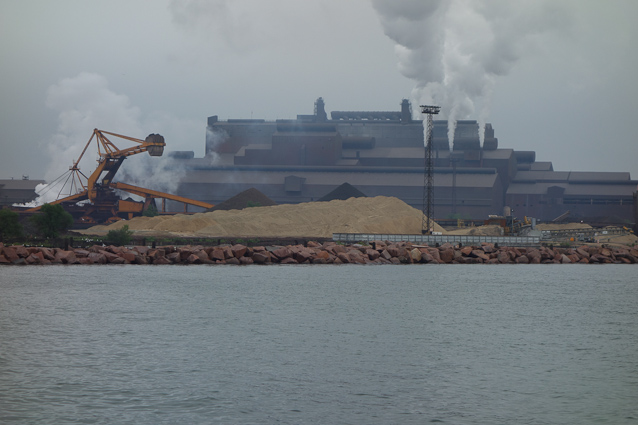 Indiana Harbor is lined with smoky, rusty buildings like this, making steel.