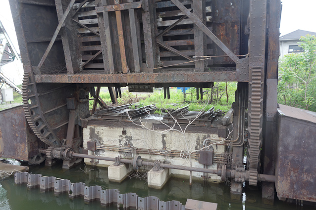 Motors in the boxes on the left and right drove small gears which rotated the large gears, rotating the large weight of the bridge, which was balanced by a counterweight.