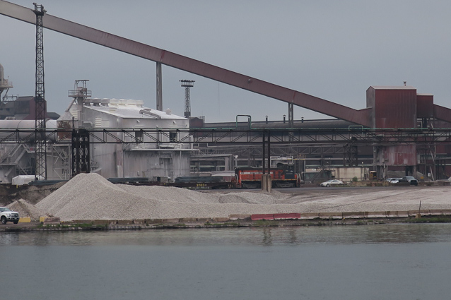 Ships deliver raw materials here for steel making. This may be limestone, one of the three ingredients put into a blast furnace along with iron ore and coke.
