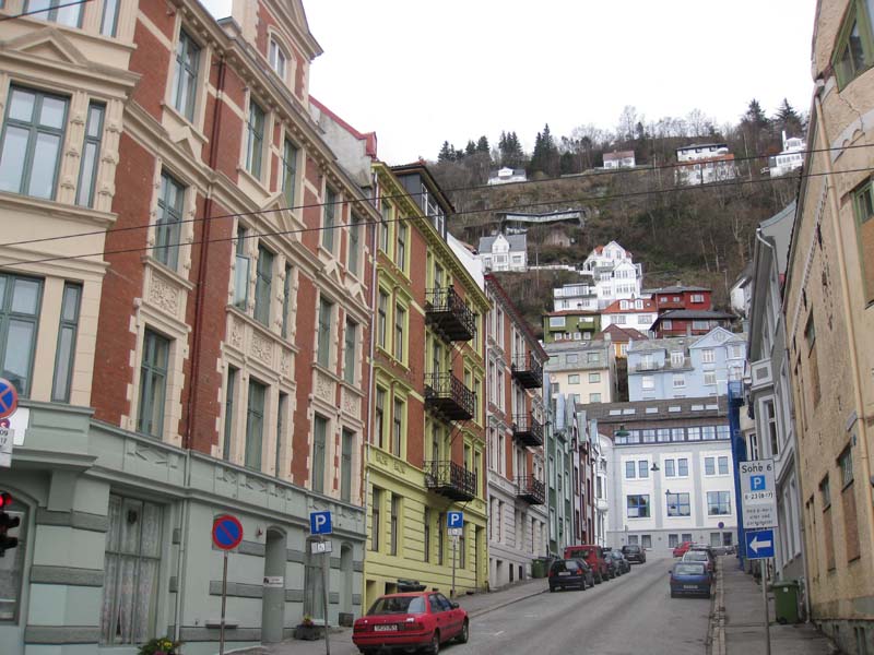 Bergen, 8 Apr Bryggen (3 gables in a row) with a stepped gable to the left and a square tower behind, a funicular car and a cable car to the upper left and waves and a square rigged ship in the right foreground