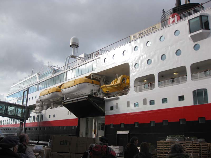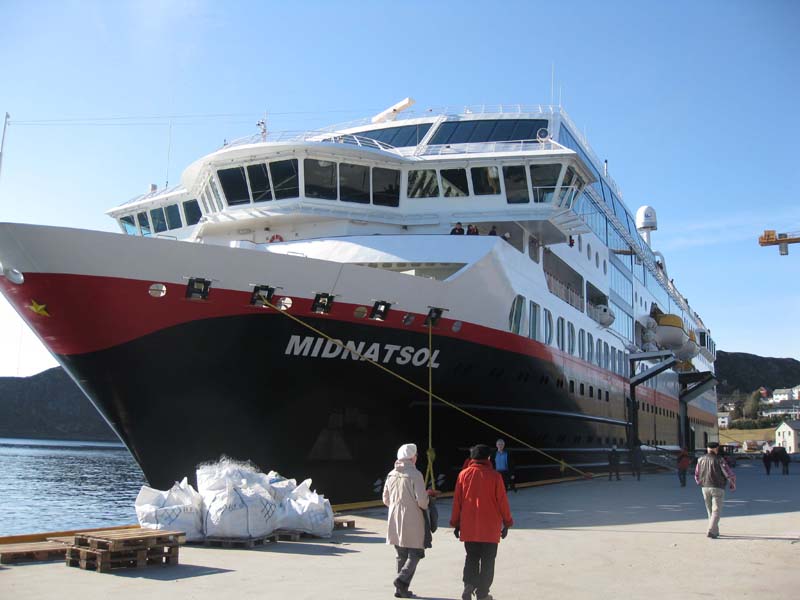 - Our ship for the Hurtigruten, the MS Midnatsol. The bow is to the left. We boarded at 5:30 PM and the ship left Bergen at 10:30.