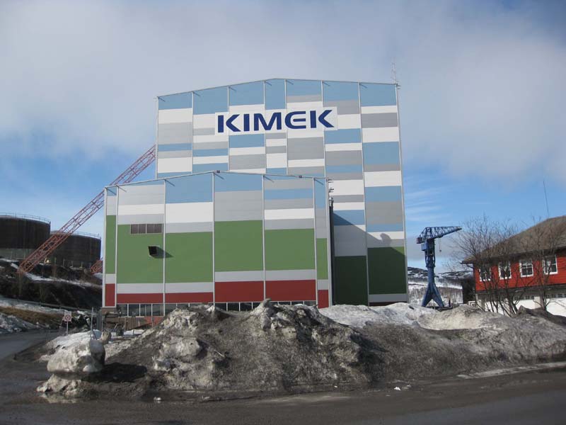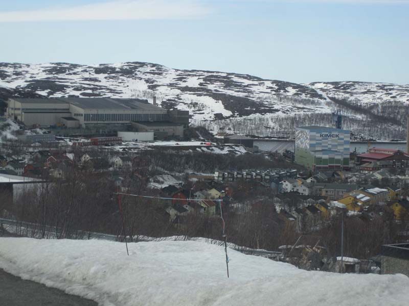 - View of the town looking west. The Sydvaranger ore processing plant is on the left, the Kimek Offshore buildings on the right, and the ore-loading pier below, on the fjord. The town is booming, with people holding multiple jobs and unemployement below 1 %.