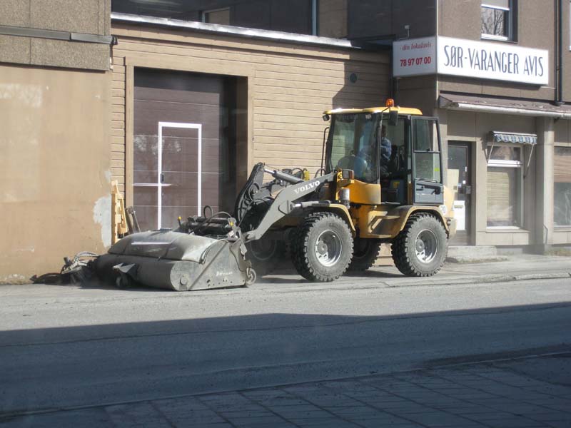 - Another street sweeper The sidewalks in many towns are scored by grooves, perhaps by snow plows. The production, distribution, and cleanup of grit must be a big business in Norway.