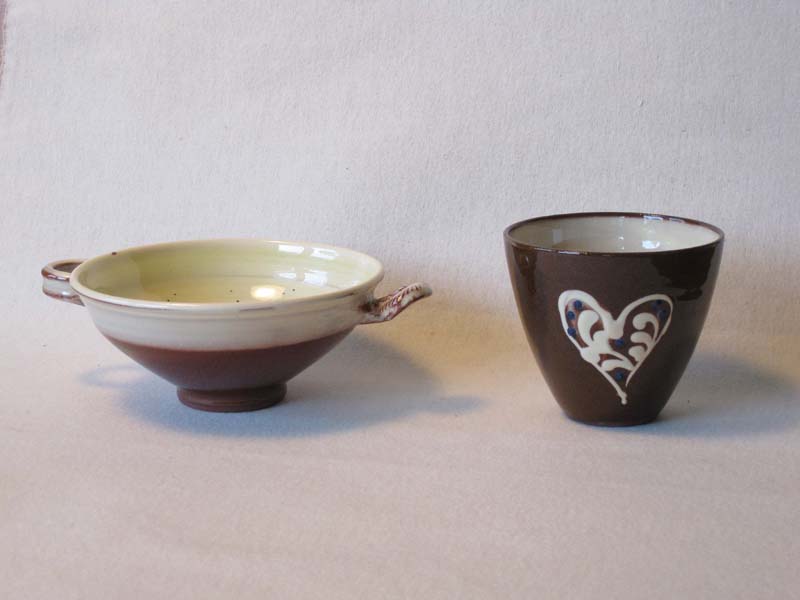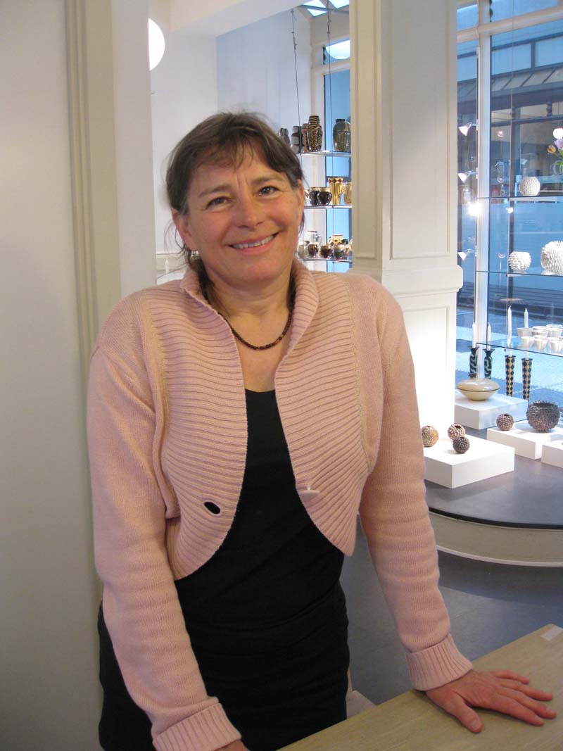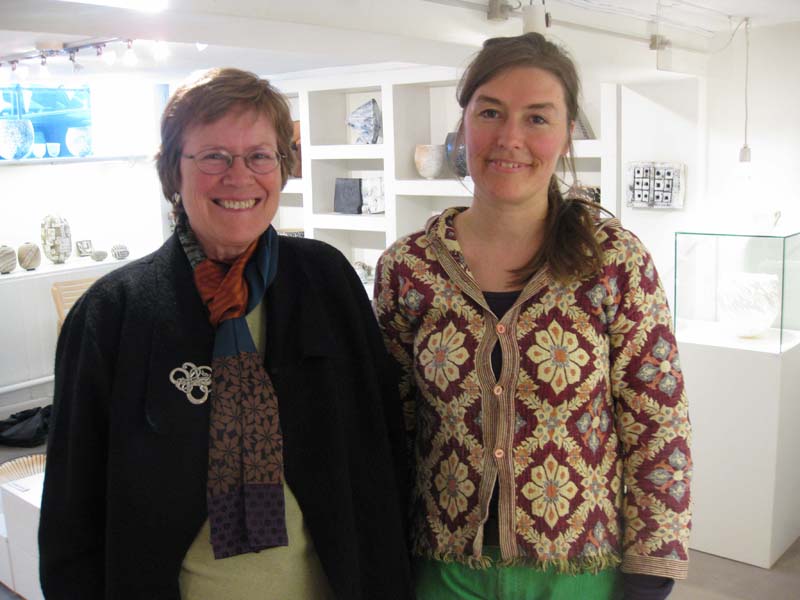 - Two potters The one on the right is Ellen Kjaergaard. She has investigated traditional Norwegian pottery and uses lead glazes. The potter on the left said that the traditional technique for applying lead glaze was to dip it in a solution made by boiling some plant product, and then blowing a lead compound in powdered form onto the work, to stick to the plant residue. When fired, a glaze was produced. Ellen uses a more modern technique.