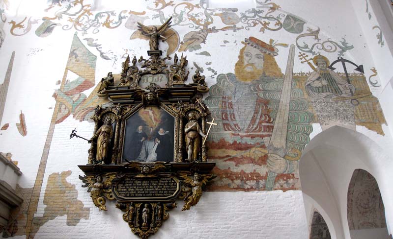 Ribe, 25 Apr Closeup: A shield holding three crowned lions on the left and a church on the right with two circular towers and a gable surmounted by three crosses.