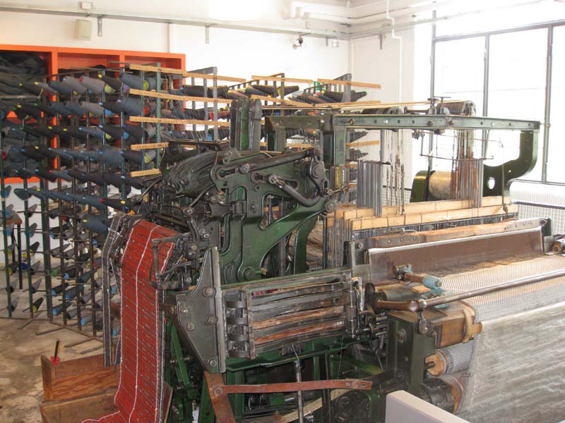 Brede Works, a large fabric mill that operated 1832-1956. The high point of our visit there was not planned by the exhibit designers: an impromptu tour of the National Museum conservation facility where wood from excavated Viking ships is being preserved. The public exhibition depicts the world of individual workers, and you are invited to assume the role of one of six workers: plant manager, master weaver, weaver, burler, knapper, or mill girl. It's dramatized sociology, with nothing much to say about the machines, materials, processes or products. There are two working looms, and Mariana had a long talk with a weaver and fabric designer operating one of those.