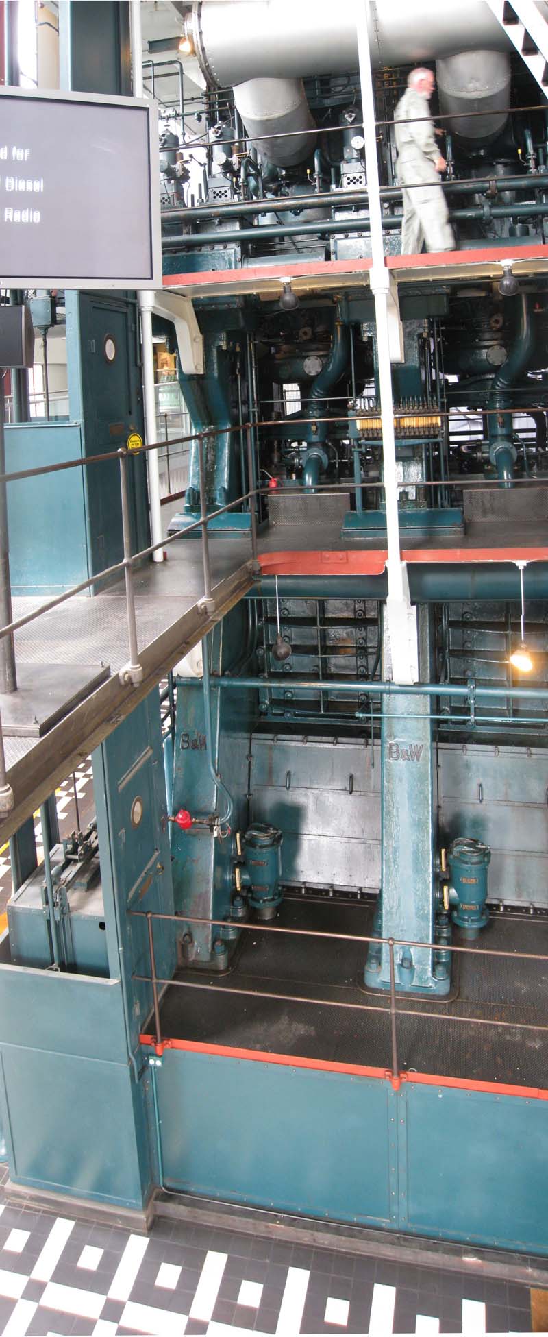 - Another view The engine has eight cylinders, all vertical and in line. The B&W stands for the Danish manufacturer, Burmeister & Wain. The engine was installed in 1933 and generated peak power and was a standby unit until 2004. It drove a single 15 MW generator.