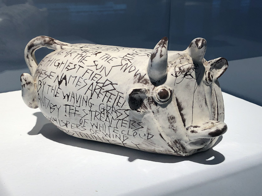"Cow" by Yagi Kazuo.1973. Clay. Collection of the Hyogo Ceramics Museum, Japan. The face of the cow is in the style of Picasso and the text is from Stephen Spender's poem "The Truly Great".